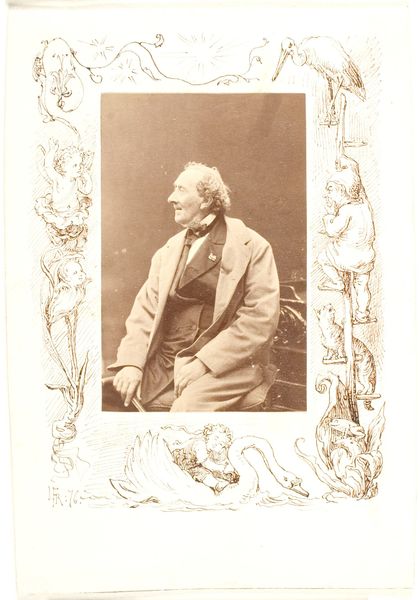 Editor: Here we have "Fotoreproductie van een geschilderd portret van Baron Brisse," a photographic reproduction of a painted portrait by Michel Berthaud, created sometime between 1876 and 1900. The triptych format really struck me; it almost feels like a religious icon, but with this very bourgeois gentleman at the center. What do you make of that? Curator: Indeed. The triptych is fascinating. It’s an inherently symbolic form, laden with historical weight, particularly in religious art. The portrait in the center immediately commands attention. Flanking him are what seem to be paintings depicting still life elements of what is probably hunted game and cultivated fruits. Editor: Yes, that contrast is really striking! The opulence on either side of this serious man in the middle... it's a little unsettling. Curator: The juxtaposition sets up a symbolic tension, doesn't it? Are these surrounding elements meant to represent his domain, his wealth, perhaps even virtues like providence or husbandry? The careful arrangement is a statement about status and values. Consider also the choice of photography to reproduce the painted portrait. What meanings does this technological intervention carry? Editor: That’s a good question. Photography democratizes art, right? Makes it more accessible… Curator: Potentially, yes. But what if it’s being used to enshrine this particular image, to lend it a different kind of permanence through a new medium? Editor: I see your point. It’s less about accessibility and more about amplifying the Baron's image and solidifying his legacy, perhaps? Curator: Precisely! It makes one wonder what he hoped this symbol would project into the future, and how our interpretation shifts with time and cultural context. Editor: I’d never considered how the medium itself could be part of the symbolic language. Thanks; that's given me a lot to think about! Curator: Likewise. These juxtapositions and repurposings of symbolic form reveal much about cultural values and individual aspirations across generations.