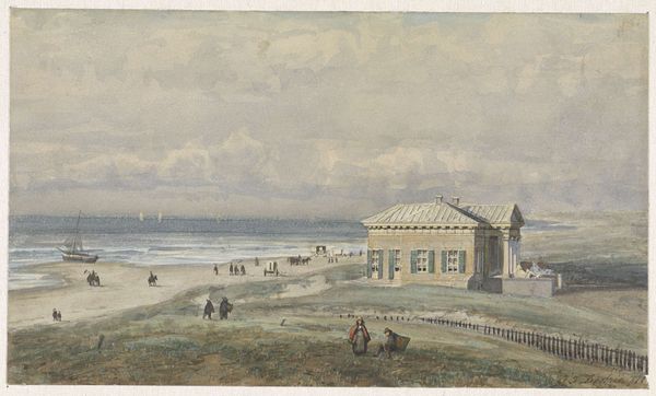 Editor: We are looking at Johannes Bosboom's "The Beach at Scheveningen", made with watercolor in 1873. There's a muted quality to it; the colours feel really desaturated, which I find sort of calming. The whole scene is composed as one gradual horizontal shift from sand to water to sky. What stands out to you in this piece? Curator: Immediately, I am struck by the work's compositional structure. Observe how Bosboom employs a limited tonal range, almost monochromatic, to create depth and atmospheric perspective. Note the interplay of horizontal lines - the beach, the sea, the sky - which are then punctuated by the vertical masts of the ships. Editor: I do see that. So the verticals punctuate it but they also mirror each other in shape as the posts and people on the right and left, keeping the image as a unified plane. Is that the intent? Curator: Indeed. Consider how the artist manipulates the materiality of the watercolor itself. The washes are thin, transparent, allowing the paper to breathe, to suggest the light and atmosphere of the beach. Bosboom is less concerned with representational accuracy and more interested in the formal relationships between line, color, and space. It all seems less to be of Scheveningen and more the suggestion OF Scheveningen. Editor: Right, it evokes rather than states a reality. I noticed he repeated several of the hues - gray, blue, white - to make a cohesive image and, thinking about it, using different values to lead your eye to distinct areas. The people are clustered darker but lighter in value where the beach and water meet. I am now more impressed with the construction of the work than what is presented. Curator: Precisely. Bosboom asks us to appreciate the painting as an object of aesthetic contemplation rather than a mere depiction of a scene. Through a deep examination of materiality, the intrinsic qualities become far more visible, wouldn't you agree?