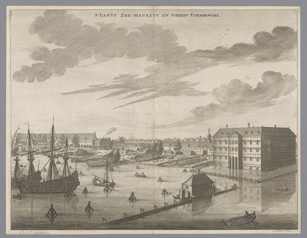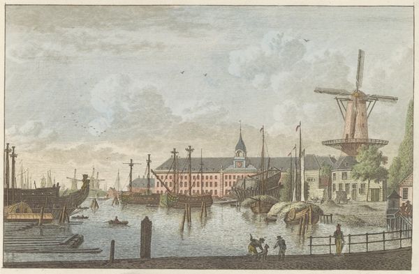 Editor: We’re looking at “Rijkswerf Willemsoord,” a watercolor by Roelof van der Meulen, made around 1825. It’s a view of a Dutch naval dockyard. The atmospheric conditions captured in the illustration are striking—the soft colors evoke a serene, almost melancholic, feeling. What do you see in this piece, from a formalist perspective? Curator: Indeed. Observe how van der Meulen orchestrates depth. He employs a nuanced application of pigment, establishing tonal variation to give a sense of recession from the foreground figures into the hazy distance. Note particularly the chromatic scaling used in rendering the water; what specific contrasts do you observe? Editor: The water closer to us is darker, more detailed, and it becomes lighter, almost blurred, as it moves away, emphasizing distance through shifts in color and clarity. Curator: Precisely. Furthermore, consider the compositional structure. The buildings are horizontal which juxtaposes with the masts' verticality creating a visual counterpoint, a harmony of form and line that activates the pictorial plane. Are the effects consistent? Editor: I notice the clouds mimic some of that verticality, acting like softer echoes of the ship masts, creating a unified visual experience. Curator: A perceptive insight. This suggests a deliberate engagement with spatial relationships, a kind of pictorial mathematics meant to engage the eye, guiding us through the tableau according to the artists structural logic. Editor: That's a new approach to waterfront illustrations for me, seeing it more as structured, mathematical and calculated and less simply as landscape observation. Thank you! Curator: A formalist methodology aims to expose intention, a careful crafting and not solely a spontaneous reaction. Food for thought.