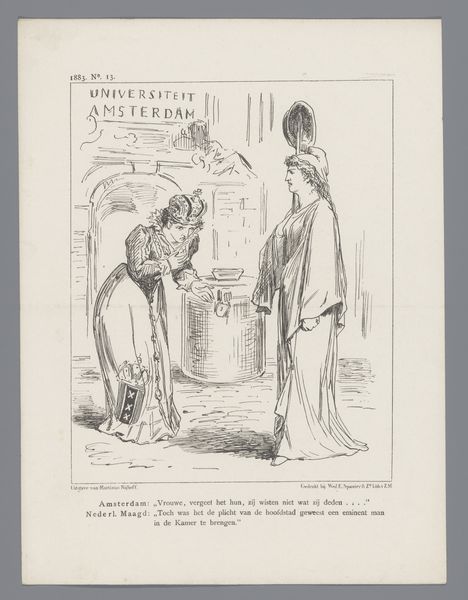 Editor: So this is "Politieke spotprent, 1882" by Johan Michaël Schmidt Crans. It’s a pen drawing, or rather a print made after a pen drawing, and I find the contrast between the heavy cross-hatching and the clean white space of the page to be really striking. What do you see in this piece? Curator: I see a biting commentary on power and class dynamics. Notice how the artist uses caricature to exaggerate features, perhaps to mock those in positions of authority. It speaks volumes about social tensions in 1882, and even today when we look at leadership. How do you interpret the scene depicted in relation to those social tensions? Editor: I guess the kitchen setting is a metaphor? The cook might be a politician? The text says something about a pudding? I think they are debating or discussing something with someone standing at the doorway. Curator: Exactly! This is a political cartoon, a critique of the powers that be, presented under the guise of a simple kitchen scene. The “pudding” becomes a metaphor for policy or governance. The cook embodies the ruling class and that woman at the doorway is probably representative of public demands or maybe the opposition. How does that lens shift your thinking on the drawing's content and its potential political messages? Editor: That context is super helpful. I was just seeing two figures, but now it feels more charged. It is as though their negotiation of ingredients suggests power struggles of who is going to gain the benefit. Curator: Precisely. And in seeing how the "heterogeneous ingredients" blend, there might be insight into the social challenges and artistic license of the day. Consider then that, with art like this, the artist doesn't just reflect society, but actively shapes our perception of it. Editor: I see what you mean. I was focusing on just the style but now I recognize the intersection of style and content to deliver an impactful political message! Thanks so much for expanding my understanding. Curator: It’s my pleasure.