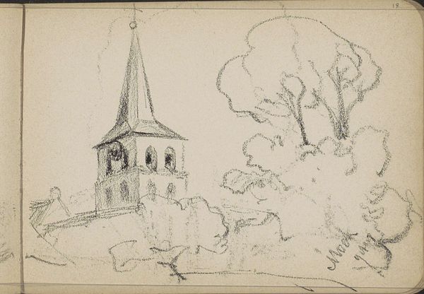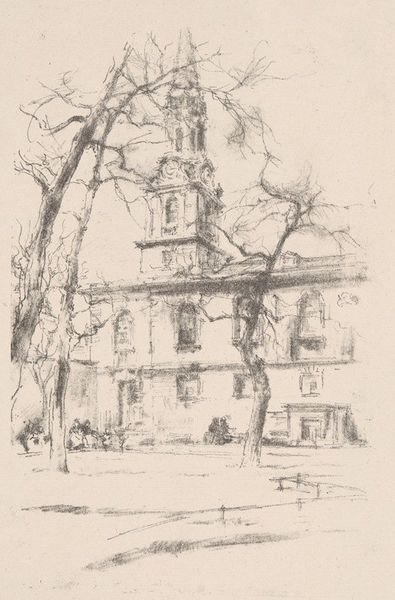 Editor: This print, titled "St. Philips Steeple Charleston," was created by Elizabeth O'Neill Verner before 1931. It appears to be a delicate, almost ghostly rendering of the church steeple amidst a tangle of branches and nearby buildings. It’s a lovely sketch, but I’m wondering what layers of meaning and context might be hiding beneath this quiet composition? What do you see in this piece? Curator: Ah, yes, Verner. I often wonder if Charleston whispers secrets to her artists; she certainly caught a particular Southern Gothic mood here. Look at how the steeple pushes upwards, striving towards heaven, yet surrounded by the barest of winter trees that feel like grasping claws. The surrounding architecture feels weighty and old, almost crushing the central spire. The print's almost fragile quality— the light pencil work—lends to this feeling of being trapped. What stories do these visual tensions suggest to you? Do you get a feeling for what Charleston might have been like in the years leading up to the Depression? Editor: I hadn't considered that sense of striving against limitations, or even impending economic uncertainty! I initially focused on the surface beauty of the sketch itself. Curator: That's perfectly valid, but what artists chose to express is as essential as how they express it. Editor: So, would you say that Verner is consciously reflecting Charleston's socio-economic environment? Curator: Consciously? Impossible to say definitively. Perhaps she was just trying to capture the beauty and the stillness. Perhaps she was more caught up in its potential fragility? Editor: That is definitely food for thought, how artists capture that certain mood...it makes me want to see the piece in person. Curator: Me too; prints, sketches, and the "unfinished" often convey a far deeper connection to place and subject than highly finished pieces.