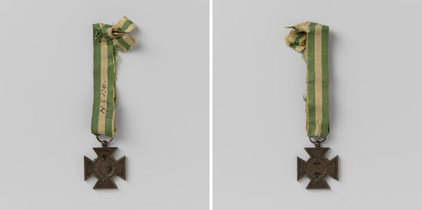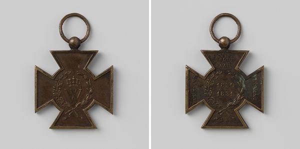 Editor: This metal relief is entitled "Remembrance Cross for the Amsterdam Police for the twenty-fifth anniversary of the reign of Queen Wilhelmina 1923," created by Johannes Cornelis Wienecke. It has such a somber yet powerful quality. What do you see in this piece, given the historical context? Curator: Well, the commemorative medal offers a fascinating lens through which to examine power structures and societal values of the time. Medals like these weren't just decorations. They served to reinforce loyalty to the monarchy and the state, particularly within institutions like the police force. Editor: So, it’s more than just an object, then. It seems like a carefully constructed narrative? Curator: Exactly. Think about the visual language here. The cross shape, even without explicit religious symbolism, invokes notions of duty and sacrifice, implicitly aligning the police force's service with a higher calling. Now, consider the portrait of Queen Wilhelmina. How does her representation contribute to this narrative? Editor: She is depicted rather regally within a laurel wreath...almost god-like. Was this common at the time? Curator: Royal imagery served as a tool to cultivate a sense of national unity. This medal solidified a hierarchical structure and a sense of unquestioned authority. I'd be curious to examine records to see how this connected with Amsterdam's evolving demographics and socio-economic tensions of the 1920s. Editor: It’s almost unsettling, looking at it from today's perspective, seeing how directly power was asserted through these kinds of objects. It gives a clearer view of the societal norms at the time. Curator: Precisely! Objects such as these can offer crucial insight into the cultural history and implicit assumptions prevalent during a specific moment in time. Editor: I’ll certainly look at medals differently going forward!