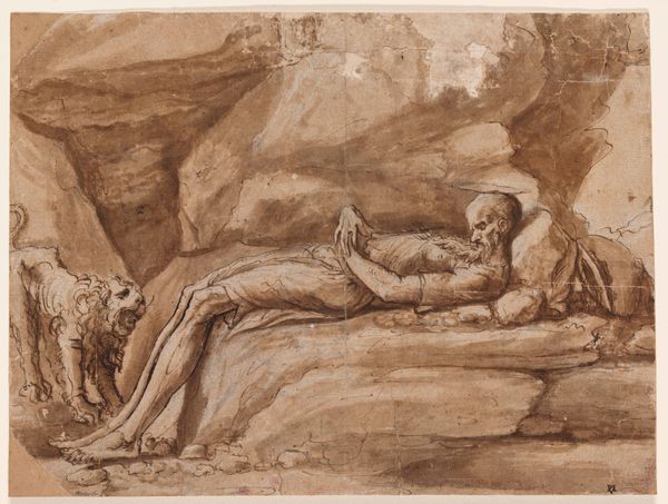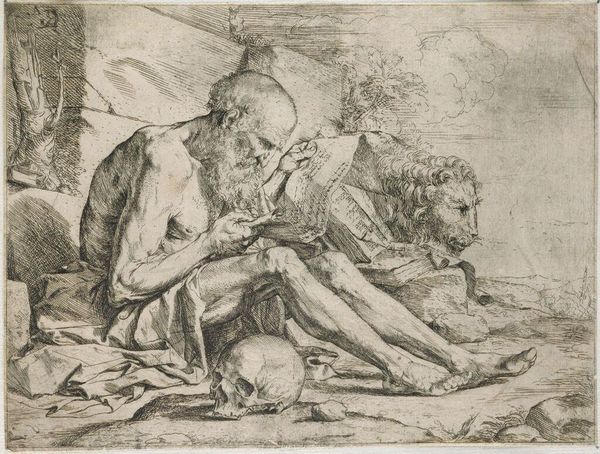 Editor: So, this is Jusepe de Ribera's "Saint Jerome Reading," an etching dating from somewhere between 1619 and 1629. What strikes me is the incredible detail achieved with what appears to be simple lines, but there is a raw emotional impact. How would you interpret the piece? Curator: Well, first we have to consider the etching process itself. Think about the labour involved, the way acid bites into the metal, each line a deliberate act. Ribera is not just depicting Saint Jerome, he is *producing* an image steeped in the socio-economic realities of printmaking, extending this through materials and reaching a new audience. Editor: I see what you mean about the process impacting the final image. Does Ribera's choice of etching rather than, say, painting, affect our understanding of the subject? Curator: Absolutely! Etchings democratized art. Multiple copies could be produced, making the image, and the ideas within, accessible to a wider audience, disrupting traditional patronage models, not just catering to wealthy collectors. He's mass-producing spirituality, in a way. Also notice how the artist depicts his main model, in a realism fashion, perhaps as to not create the impression he is of greater substance. Editor: That makes a lot of sense! So it's about how art is made and distributed, and who has access to it. The materiality influences how we view its context. Curator: Exactly! Consider also the economic impact. This wasn’t just about spiritual elevation; it was also about Ribera earning a living. This print, a tangible commodity, allowed him to participate in a developing art market. By acknowledging the conditions under which art is made and circulated, we get a more complete view of this piece, it is more than "Saint Jerome". It represents art, economy and material intersecting to transmit not only its artistic message but also historical one. Editor: So, we have to think about art's material existence to truly understand its meaning and impact? I'll definitely remember that, it has shifted how I am thinking of interpreting the piece.
