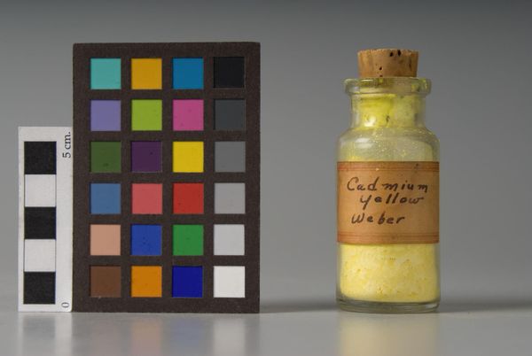 Curator: This is a vial of "Strontian Yellow" pigment manufactured by Charles Roberson and Co., around 1914. It feels almost like alchemy. Editor: It's lovely, a muted sunbeam captured in glass. And next to the color chart, it’s like seeing potential waiting to be unleashed. Curator: Yes, it’s more than just pigment; it’s a portal to understanding the materiality of art production during that era. Roberson was a key supplier. Editor: So, each little grain represents the possibility of, say, a Monet or a Whistler? It’s humbling, the raw stuff of masterpieces. Curator: Precisely, it highlights the labor and industrial processes behind art. It reminds us that art doesn't spring from nowhere. Editor: It makes you wonder about the human touch involved in creating this single vial. Something so common now was still remarkable then. Curator: Absolutely, it connects us to the world of artists and artisans, their tools, and their dreams. Editor: A silent revolution in a tiny bottle. Amazing.