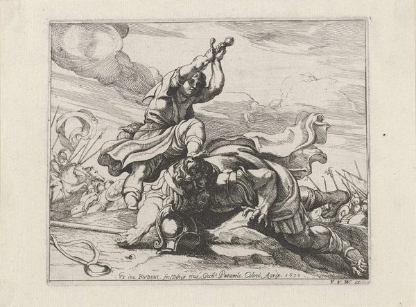 Orazio Borgianni created this print depicting Moses receiving the tablets of the law. Borgianni, an Italian artist, worked during a period of intense religious and political upheaval in Europe. The print captures a pivotal moment from the Old Testament, laden with themes of divine law and covenant. The image suggests questions of religious authority and cultural identity. Moses, often seen as a patriarchal figure, is here portrayed in an act of receiving, almost surrendering, to divine power. The figures at the bottom of the mountain are in awe. What does it mean to witness such an event? Prints like these were significant in disseminating religious narratives, reinforcing cultural values, and shaping public perception. Borgianni's work invites us to reflect on the power dynamics inherent in religious narratives, and how these stories continue to influence our understanding of law, authority, and identity.