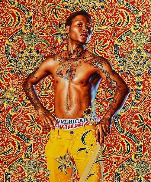 Curator: This piece captivates me with its sheer size and presence. It is a striking portrait, almost life-sized, commanding immediate attention. Editor: Indeed. Here, we have Alfred Conteh's "Jimmy," a captivating exploration of identity rendered in acrylic paint. Notice how Conteh employs a hyperrealist style with bold choices in figuration and color to construct this striking composition. The effect, in a word, is masterful. Curator: What hits me first is this monochromatic purplish-blue tone contrasting so fiercely with that aggressively cheerful yellow background. It makes him pop but also, paradoxically, feels like a statement, like a mood. It is very compelling, and it feels symbolic. Editor: The monochromatic scale lends the work both depth and intensity. The chromatic interplay creates dynamic tension; gold as foil to indigo amplifies the sitter’s gravitas. Further adding texture is a striking pattern resembling a dried cracked surface. It provides depth to what may have become a flat background and adds to a layered story that is implied in the artwork. We should further examine the subject’s features as a reflection of contemporary realism's interest in complex personhood. The tattoo, jewelry, and stylized hair serve to create context while raising numerous questions for the viewer. Curator: Totally! I feel like there is an assertive modern take here. The gold backdrop, textured and almost distressed, behind the smooth face is striking. What stories does it conceal? Is the face merely an avatar in our digital times, layered with signs, yet detached, almost placid? Also, the eyes seem unfocused, reflective…lost maybe? Editor: An intriguing point, yet that leads me to suggest the psychological depth and expressive treatment that marks Conteh's genius may stem from his ability to evoke the emotional ambivalence we perceive daily, if subliminally. A key element worth considering would involve how neo-expressionism and contemporary portraiture collide within "Jimmy.” It challenges conventions of what identity is understood to convey vis-a-vis contemporary figuration. Curator: Yes! I love how we read something unique each time! Well, this was indeed food for thought. I hope visitors appreciate diving into what this acrylic canvas brings to the surface! Editor: Indeed, I trust listeners feel well-equipped now to explore just some ways "Jimmy" stimulates and confronts. A unique piece deserving far more inspection!