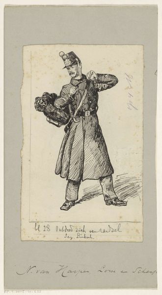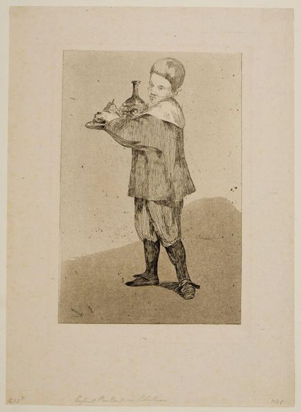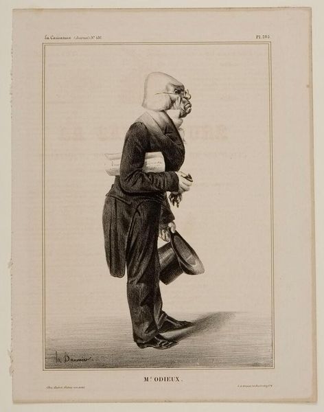 Editor: This is Honoré Daumier’s "Mr. Royer-Col," a lithograph from the 19th century. The exaggerated features create a rather comical, yet unsettling effect. What symbols do you see at play here? Curator: The diminutive suit acts as a powerful symbol of the subject's ego, inflated beyond his actual achievements. Daumier often used clothing to signify societal roles and pretensions. Does it remind you of any similar depictions in popular culture today? Editor: I suppose you could say it's like political cartooning? Curator: Precisely. The small suit mocks the self-importance of political figures, a theme that continues to resonate. Understanding this symbolism allows us to unpack the cultural anxieties Daumier was addressing. Editor: I see! So, it's more than just a funny picture. Curator: Indeed. It's a timeless commentary on power and perception.