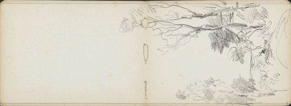 Curator: Look at this fascinating work titled "Omgevallen boomtak" or "Fallen Tree Branch" created by Maria Vos sometime between 1834 and 1906. What is your first reaction? Editor: Utter desolation. I'm immediately struck by its skeletal sparseness, a bone-like scattering of lines on the right page of what appears to be a sketchbook, opposed to nothing on the left, an empty plane of loss. Curator: Exactly! Vos really captured the romantic idea of nature in ruin here. Consider the materiality of it though, just humble pencil and ink on paper. It shows us her process and immediate connection with nature. The drawing becomes more about labor and less about some highfalutin ideal. Editor: Ah, I can agree to disagree... Isn't the choice of delicate pencil strokes a conscious one, a decision meant to mirror the fragility of life itself? It speaks to the transient, romantic perception of a world perpetually in decline. This choice of material emphasizes emotionality rather than labor. The subject on the right, balanced by its own absence on the left is the key! Curator: Absence certainly plays a key role in evoking melancholy. Consider it in terms of artistic practice, Maria's notebook may have been an ordinary thing of bound paper; the source may have been commonplace graphite, readily procured and applied by hands toughened by daily drawing. The artist elevated her humble experience! The production value becomes integral! Editor: I hear your pragmatic heart beating, yet I still interpret this piece through a more personal lens. Isn’t art about infusing everyday materials with extraordinary meaning? These fragmented lines, dancing between stark realism and gentle suggestion, capture that singular moment of confronting mortality. And I believe that makes it incredibly impactful. Curator: Indeed! In her close study of an organic form with modest materials, she makes visible a particular perspective about process and place within a landscape and time. Thanks for bringing my attention to it, it brings even more to light how important a role materiality plays in reading imagery! Editor: And thank you for pushing me to examine my initial emotive reactions more critically and acknowledge that connection! There is always more to these images when we consider our different viewpoints, the final reading is just an interaction of two unique viewpoints meeting at an apex!