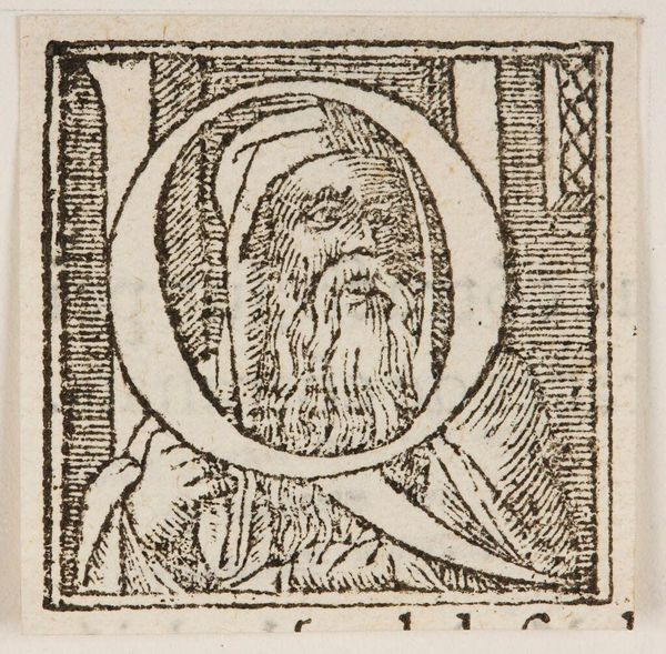 Editor: This is the woodcut "Letter T", by an anonymous artist. It depicts a monk holding what looks like a writing tablet, nestled within the letterform. What strikes me is the way the letter is integrated with the figure. What do you make of this interplay? Curator: It's a great observation! Initial letters like this weren't just decorative; they were often imbued with social and religious meaning. Consider the function of illuminated manuscripts - how the Church commissioned these to underscore their power. Editor: So, the monk could be interpreted as a symbol of knowledge and religious authority? Curator: Precisely. And the style of the woodcut itself speaks to its historical context, think about the rise of printing and its impact on disseminating knowledge beyond the elite. Editor: That's fascinating, I hadn't considered the wider implications of printmaking. Curator: These images are more than mere decorations; they reflect the power structures and intellectual currents of their time.