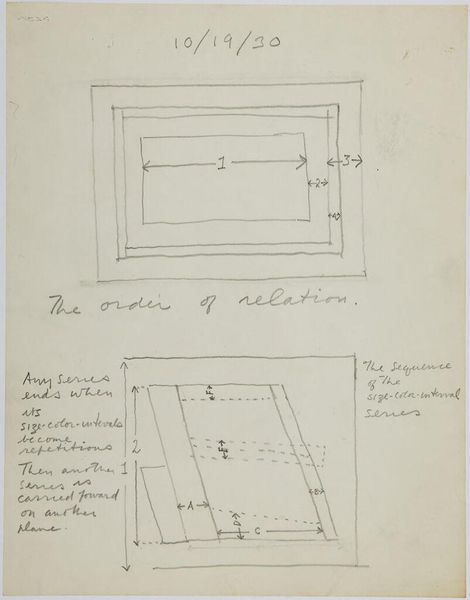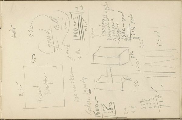 This is Carel Adolph Lion Cachet’s sketch, "Drie rechthoeken", whereabouts unknown, made with graphite on paper. The off-white of the paper and the grey graphite give a limited tonal range to this open, diagrammatic composition. The three rectangles sketched on the page seem to be searching for the right dimensions for a frame or a window, or maybe a painting? To the left, the lines describing the rectangle are darker and more confident, so perhaps this is the one. It's interesting how Cachet combines drawing with writing and notation to explore the possibilities of a form. I find myself wondering: what's the relationship between the hand, the eye and the mind, when an artist is working something like this out? It reminds me of Sol LeWitt's wall drawings, where the idea is more important than the execution. But here, it's the process of thinking and making that really shines through. It’s not about perfection but about the ongoing conversation between artist and artwork.