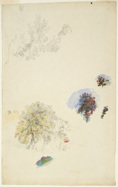 Paul Cézanne created this delicate watercolor, "Flowers," with translucent washes of pigment on paper. The composition is dominated by a cluster of leaves and a single red flower, centrally placed. The surrounding foliage is rendered with subtle gradations of green and blue, creating a harmonious balance that evokes a sense of serene contemplation. Cézanne's approach here is intriguing, for he destabilizes the traditional still life. The incompleteness of the surrounding sketches suggests a work in progress, or perhaps a conscious decision to leave certain areas undefined. This technique emphasizes the materiality of the medium, drawing attention to the interplay between the white of the paper and the applied pigments. The visible brushstrokes and unfinished sections invite the viewer to consider the process of creation itself, rather than merely the final representation. Cézanne challenges the fixed idea of what a painting should be, making "Flowers" an ongoing exploration of perception, representation, and the very essence of painting.