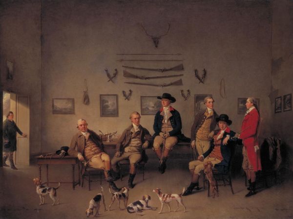 Curator: Welcome. Here we have Frank Mason's "Little Italy," an oil-on-canvas piece dating to 1977. Editor: The light in this…it's nostalgic. Like a half-remembered dream of a place I've never actually been to, yet somehow deeply miss. Curator: It’s a captivating snapshot of a community space, rendered in that approachable, figurative style. You can almost feel the energy of this neighborhood hub, wherever it may be located. The artist captured that feeling when people just meet and share. Editor: It definitely has that timeless quality. It feels almost theatrical. Is it me or is there an intriguing story simmering just beneath the surface? That checkerboard floor gives it that feeling, too. Curator: Precisely! Mason was interested in the human condition, of which social interaction is a significant part. "Little Italy" becomes an insightful glimpse into everyday lives during that era. The cultural implications of the "portrait" style when depicting a group opens questions about social identity in that time period, what stories does it hide? Editor: Look at that bartender; his smirk hints he's privy to all the goings-on. And everyone is placed in such deliberate placement. Did the artist invite specific individuals? I wonder, did he have them sign some release of likeness for his art? Ha! I also wonder if anyone recognize their relatives hanging here... Curator: It's interesting to note how genre paintings like these also served a historical role, immortalizing not just faces but a community fabric that has gone by now. The way the artwork presents it helps us to preserve part of it to our days. Editor: The entire space just calls you in for a glass of chianti, right? Makes me want to know everybody's story and what's being said over each table. Makes one feel lonely and at peace. Curator: A real testament to the enduring power of figurative work that speaks beyond a certain moment. It reflects the communal and shared moments that bind our stories, while it creates an open space for discussion of themes such as "community," or "heritage." Editor: Makes you realize how vital sharing a moment like that with another is. Okay, so where's the closest "Little Italy," and what's good?