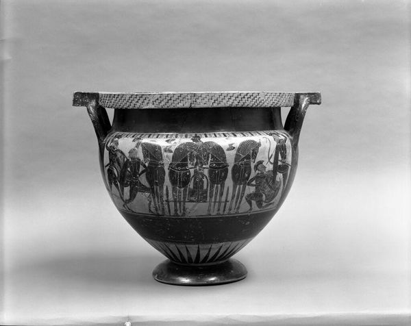 Editor: Here we have a fragment of a terracotta column-krater, or bowl for mixing wine and water, dating back to 590 BC. Looking at the intricate black figures painted on its surface… I’m immediately struck by how much action is crammed into such a small space, especially with all those animals. What stories do you think it’s trying to tell? Curator: Ah, a shattered window into another world, isn't it? Imagine this bowl, whole, brimming with diluted wine at a symposium. What stories would *it* tell, eh? The layers! See the top frieze: battling men, perhaps heroes or gods, locked in combat, their shields overlapping like scales. Below, horses prance, riders perched precariously. And beneath them? Are those deer? Or some mythical beast, grazing, oblivious to the drama above? It feels like a snapshot of their worldview - chaos, nobility, and simple animal existence all swirling together, mixed and potent, like the wine it once held. Does that resonate with you? Editor: It definitely gives a glimpse into their stories and beliefs, though the scenes also feel a bit… distant? I can’t quite put my finger on it. Curator: Distance isn’t a flaw, my dear, sometimes it's a virtue. It’s like trying to recall a hazy dream - you grasp fragments of memory, images, feelings, yet the full picture eludes you. And isn’t that true of most histories? We pick through broken pieces hoping to feel what was. Look closely - do the postures of those fighting men suggest any feelings? Or maybe the movement of those animals. It may hint at something, but will not give it all. That, I find incredibly appealing! Editor: I see what you mean. It is up to us to complete that full picture, isn't it? Maybe that is why history can feel so personal sometimes. I’ll definitely look at fragmented artworks with a different lens now! Curator: Excellent, now pour us a glass and tell me what you see... but perhaps, next time, from a fully-formed chalice!