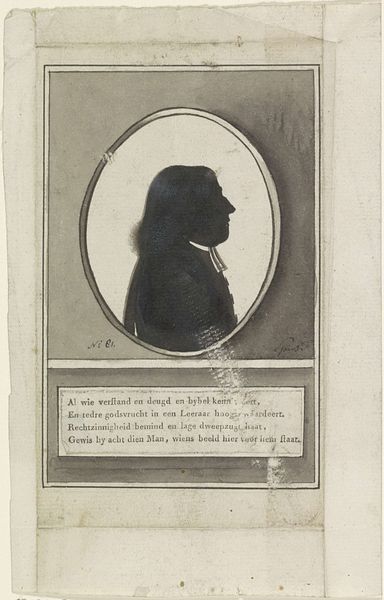 Sophia Wilhelmina Evans created this silhouette portrait of J.W. Bussingh using pen in the late 18th or early 19th century. During this period, silhouette portraits were a popular and affordable way to capture a person's likeness, offering a contrasting alternative to painted portraits, which were more costly and time-consuming. Evans, as a woman artist, navigated a world where artistic recognition was often limited by gender. The text accompanying the image suggests a narrative of virtue and resilience. The sitter, Bussingh, is portrayed as someone who has been tested by a grim fate, yet remains brave, great, and aligned with God. This description could reflect the social values and expectations of the time, where moral strength and religious devotion were highly esteemed, particularly for men in positions of authority. Consider how Evans, through the medium of silhouette, captured not just an image, but an idea of identity. The emotional weight of the portrait lies in its stark simplicity, inviting us to contemplate the life and character of Bussingh.