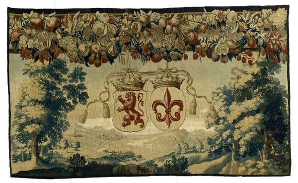 This tapestry presents the family crests Oetgens van Waveren en Spiegel. Notice how Tobias Schaep has constructed an orderly composition that evokes a sense of dynastic pride. The rectangular format is divided into three distinct zones. In the central zone, the heraldic emblems are rendered with gold and red against a dense blue ground, immediately drawing the viewer's eye. The escutcheons are framed by symmetrical foliage and topped with a griffin-like figure, suggesting power and lineage. Zoomorphic forms such as lions, horses, bulls, and goats fill the periphery with dynamic energy; they are strategically placed to balance the overall design. The tension between heraldic symbolism and decorative elements destabilizes any singular meaning, allowing the tapestry to function aesthetically as well as symbolically. Note how the interplay of color and form reinforces the tapestry's formal structure, creating a rich visual field that invites ongoing interpretation.
