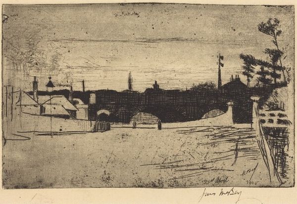 Curator: The work before us, “Quai Boieldieu in Rouen,” was composed by Camille Pissarro around 1896, a cityscape captured in pen and pencil. Editor: Oh, it feels wonderfully transient! Like a fleeting thought given form. There’s something haunting about its greyscale, as if the color’s been deliberately drained to focus on form and feeling. Curator: Pissarro often returned to urban subjects late in his career, depicting the hustle and bustle of cities from hotel windows. I find it a powerful symbol for a time of great societal change. What symbolic resonances do you see within the image itself? Editor: Water is present and potent. Beyond its literal representation as a harbor, it is a fluid and fluctuating threshold between consciousness and unconsciousness, reflecting the constant flux of urban life. Notice how the sharp, angular architecture in the background meets the swirling pen strokes depicting the sky; an intersection between the enduring human ambition and the ceaseless changes in weather and atmosphere. Curator: It seems like a memoryscape, not really impressionism exactly. I love how he captures the industry's energy with these brief marks. One can almost feel the clamor of stevedores and wagons. Editor: Exactly. I find the monochromatic tones amplify a sense of looking at a fragment of collective memory. And there is almost a melancholy to this muted industrial scene that invites contemplation of how much the industrial heartlands shaped the identities of urban dwellers. Curator: His hand moved quickly, didn't it? There is so much vitality conveyed using limited detail. You look beyond the individual boats or buildings and absorb it. Editor: Precisely. Pissarro delivers us a feeling rather than a mere photograph, a dream in charcoal and graphite that is eternally imprinted upon Rouen's waterfront.