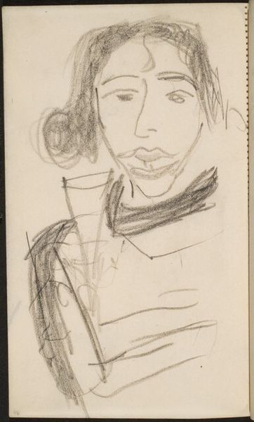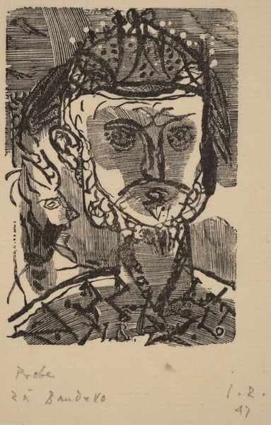 Curator: At first glance, it's a fascinatingly peculiar piece. The immediate feeling is a playful but unsettling tension. Editor: Precisely. Let's explore Jiri Balcar's "Absurd Profile," created in 1946 using etching and ink. It’s an example of how figuration can push the boundaries of reality into something almost dreamlike, fitting into the Surrealist art movement. Curator: That stark black ink against the paper’s stark off-white is part of what creates the mood, a strong sense of alienation or existential pondering. There’s something vaguely familiar in the profile itself, and yet utterly bizarre with its odd symbology. I notice the eyes. A triangle? What are we to make of this abstraction, as it floats above the realistic mouth? Editor: The symbolism, definitely. Take that miniature chair perched on his shoulder, or the stick figure seemingly pinned to his jacket. Chairs represent authority or even imprisonment, implying societal burdens weighing down the individual. The stick figure suggests innocence perhaps constrained or abused? It creates a narrative about the modern human condition after all of the upheaval of war, and its effect on the individual psyche. Curator: The hat is interesting as well; stars poking out of it seem almost childlike, juxtaposed against the angular adult facial features and the starkness of the lines themselves. There's a real sense of disjointedness. Is this some visual representation of postwar cognitive dissonance? Editor: Absolutely. But look at the composition too; how the geometric elements create planes within the face, how the crosshatching adds depth in some areas while others remain deliberately flat. These stark choices give it visual interest, but also emphasize the sense of fragmentation. It invites endless readings based on visual experience and interpretation of forms and signs. It's this visual paradox. Curator: So, an image wrestling with identity in a shattered world. Editor: Perhaps, a visual meditation on how we perceive and process the world when what was once solid, breaks. It’s why Balcar’s exploration remains striking today.