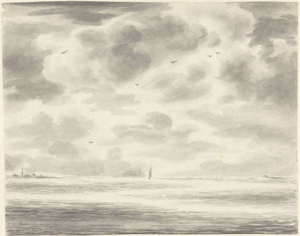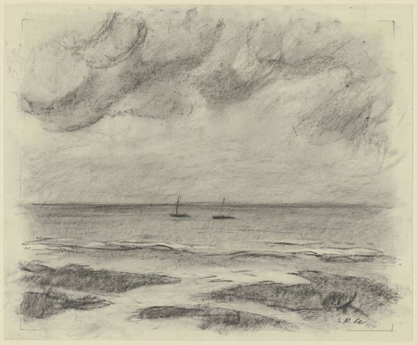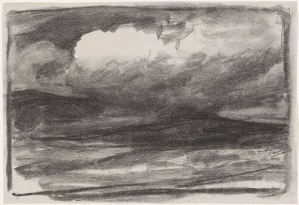 Curator: It's so evocative, this small sketch. Brooding, even. The sky seems ready to burst. Editor: That’s a sharp reading. You’re standing before Jozef Israëls’ "Landschap met donkere wolken," or "Landscape with Dark Clouds." It's believed to have been created sometime between 1834 and 1911 and is currently held here at the Rijksmuseum. You can see it's primarily pencil on paper. Curator: Pencil captures that ephemeral, fleeting quality of the light so well here, doesn't it? Like a memory fading even as you grasp for it. Notice how the lines darken towards the horizon line, emphasizing that meeting of sea and sky, that point of limit and possibility. Editor: Absolutely. Israëls, of course, was working within a charged political climate. How might this sort of landscape have resonated with viewers familiar with, say, social unrest? Curator: Oh, powerfully. Dark clouds in art have long been used as a visual metaphor for societal storms. I think we subconsciously relate dark, looming weather with moments of collective anxiety and fear, uncertainty for the future. This piece taps directly into that deeply ingrained response. But look, isn’t there something also hopeful about the small sliver of light breaking through on the horizon? Editor: That's the fascinating tension, isn’t it? Israëls provides this beacon—the implied potential for change and overcoming. It's subtle, almost hidden. How radical was it for the artist to find symbolism of freedom and societal reform, by using elements found within nature? Curator: Exactly! I think in that sliver of light we can see our own individual anxieties mirrored back, but tempered with a visual suggestion of perseverance and resolution. We look, and our inner monologue shifts slightly towards self-assurance. Editor: Israëls offered social critique that still resonates profoundly today. In his artwork, even threatening atmospheric conditions do little to completely suppress our need to overcome challenges. It is not enough to see things as they are. Curator: He offers us a beautiful reflection on finding strength within the shadow, and the ever present hope of transition. Editor: Thank you. We hope you appreciated this brief journey into Israëls’ atmospheric world and how landscape can mirror cultural concerns.