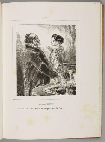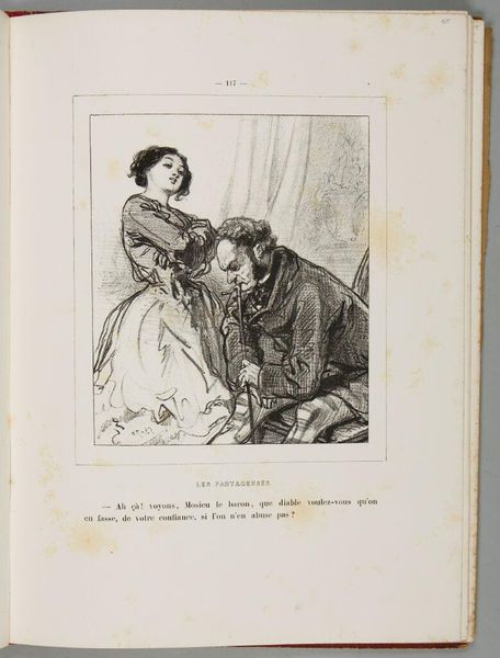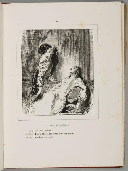 Editor: This is Paul Gavarni's print, "Dear God! As I was born honest! Never a man who wouldn't suit me! ... who would be nothing to me!, p. 115". The women depicted seem caught in a moment of reflection, maybe disillusionment. What can we unpack here? Curator: Gavarni's work, particularly his depictions of women, often critiques the social constraints placed upon them in 19th-century Paris. Consider the title – is it a genuine lament or a sarcastic jab at societal expectations of women and honesty? Editor: So, it's not just about the image itself, but also about what Gavarni is trying to say about women's roles? Curator: Precisely. How does this image challenge or reinforce those roles? Think about the setting, their clothing, and their interactions. Editor: I never thought about it that way before. Now I see the print as a commentary on the limited options available to women at the time.