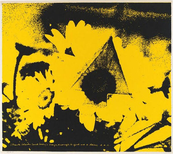 Curator: This vibrant serigraph, about 57 by 29 centimeters, is titled "road sign (1st part)" by Corita Kent. Editor: It's quite striking! The high-contrast yellow and brown create an immediate sense of graphic boldness and urban grit. Curator: Indeed. Kent frequently incorporated elements of pop culture and everyday life into her work. Here, road signs become abstract shapes. Note the strategic use of positive and negative space. Editor: Those road signs, though fragmented, evoke potent symbols of direction and choice, even control, in a rapidly changing world. The "route" and "cable" signage—are they literal or symbolic, perhaps hinting at communication pathways? Curator: Kent’s genius is inviting such layered readings. The composition’s disruption reflects the complexities of modern experience. The artist encourages viewers to challenge conventional perceptions. Editor: Ultimately, a potent visual statement on the layered meanings embedded in our everyday surroundings. Curator: A beautiful examination into the semiotics of the street.
