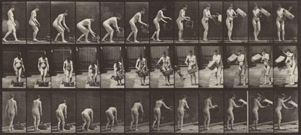 Curator: I’m immediately struck by the sense of play here— almost a mischievous energy. It’s like watching a secret ritual, these figures captured mid-splatter. Editor: This is Plate 408 from Eadweard Muybridge's "Animal Locomotion," a gelatin silver print made in 1887. We see a sequence of images capturing two nude models interacting with water— one seemingly pouring water over the other from a height. Curator: Animal Locomotion. So, the figures become almost… specimens? I can’t help feeling that’s dehumanizing. Editor: Well, the project was largely funded by the University of Pennsylvania, meant to investigate and document aspects of animal and human movement for scientific study. The reduction to discrete frames does risk objectification, especially considering the prevailing societal norms regarding the representation of the nude figure at the time. Muybridge’s work highlights that intersection of science, art, and social perception. Curator: It is technically marvelous, though, isn’t it? He really did pioneer a way of seeing movement. Imagine before this, those split-second actions simply didn’t exist in the public consciousness in quite the same way. What are the models feeling, do you suppose? A fleeting cool splash, or self-consciousness? Is it meant to titillate? Inform? The neutral backdrop really offers up a clinical, sterile vision to that end. Editor: Exactly. These images contributed to both artistic and scientific understanding, providing reference material for painters and sculptors eager to capture accurate anatomy and movement. Think about how Edgar Degas' paintings or Rodin's sculptures owe a debt to works like these. It is history. Curator: And how fascinating it is to remember what "shocking" looks like as time rolls by. It becomes historical evidence. To look at the human in motion frozen within the mechanical frame, an aesthetic wonder even now! Editor: Yes, Muybridge leaves us pondering how perception and cultural attitudes affect how we value something for its artistic expression, its factual accuracy, or both. Thank you for joining me as we reflect on that!