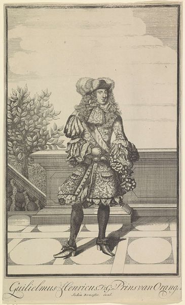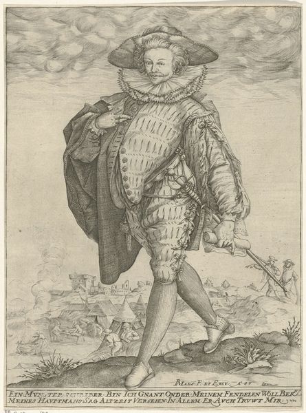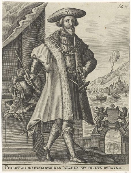Curator: Alright, here we have Christoffel van Sichem I's 1626 engraving, "Portret van Alessandro Farnese, hertog van Parma." What strikes you immediately about this print? Editor: The elaborate armour, it's like he's wearing an exoskeleton made of lace. There’s such formality to his presentation that almost tips into the absurd, doesn’t it? The world shrunk down to a meticulously rendered shell. Curator: Yes, exactly! Sichem, working in that Dutch Golden Age Baroque style, was so meticulous in capturing texture, especially the armor and ruff. Farnese, a key historical figure as Governor of the Netherlands, is immortalized through this precise detail. Editor: He's powerful, for sure. But power isn't simply worn, it’s crafted. Notice the shield—it deflects literal and metaphorical assaults, reinforcing that rigid control demanded by aristocracy and, inevitably, projected through images like these. He stands above the people with the sky overhead and they can't access or reach what is around and within him. Curator: You’re right to highlight the implied layers. His family crest there, on the right, next to that peculiar helmet, is a potent symbol of his lineage and authority in that region, especially considering the context of Dutch revolt at the time. Editor: These power displays become part of a theater of dominance. The rigid pose, the calculated angle of his stance, even the spear leaning across his leg; these aren’t innocent flourishes. This controlled image normalizes asymmetrical power dynamics, suggesting he’s not just a man but a dynastic figure. Curator: It's all a performance of stability, amidst incredible tension, that’s exactly how Baroque prints worked! Sichem created the work many years after Alessandro’s passing and as an artwork commissioned and likely controlled by someone wishing to celebrate him. The details really give it life. Editor: Perhaps, but those details solidify existing paradigms of who wields control. I always feel it's key to approach even beautifully rendered historic portraits with an eye to the forces, ideologies, and power structures they tacitly support. What purpose this print served, really? Curator: Indeed. What once impressed can also be reframed as propaganda. So fascinating how even a relatively small engraving like this, from centuries ago, offers a world of viewpoints. Editor: Absolutely, making us ask: who truly holds the power, then and now, in shaping our perceptions through representation?