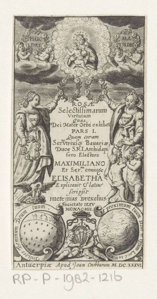 Editor: So, this engraving, "Petrus en Paulus" from 1616, at the Rijksmuseum, appears to be a title page. It feels very formal, almost architectural, with the figures flanking the central text. The fine lines create incredible detail. What strikes you most about its composition? Curator: Formally, the symmetry is quite deliberate, is it not? The composition exhibits a rigid structure, almost as though mirroring the theological order it purports to contain. Note how the figures of Peter and Paul act as supporting columns for the title cartouche, mirroring the architectural elements above. Do you see how the radiant "IHS" monogram at the apex creates a focal point, drawing the eye upwards? Editor: Yes, it's all very balanced. The eye definitely moves upward, following that vertical axis. And the textures created by the engraving technique give a tactile quality, even in a reproduction. Curator: Indeed. The engraving itself employs a meticulous system of hatching and cross-hatching to simulate depth and volume. The density of lines in the shadows and the sparser lines in areas of highlight create a convincing illusion of three-dimensionality on a flat surface. The frame further provides order and perspective in the image. Editor: I see. So the structure and the technique both contribute to a sense of order and authority. The balance and control enhance its meaning. It shows me the formal elements emphasize the importance of religion. Curator: Precisely. It provides insight to religion from this era. Editor: This really has broadened my insight into Baroque visual language. Curator: It has aided my recognition as well!