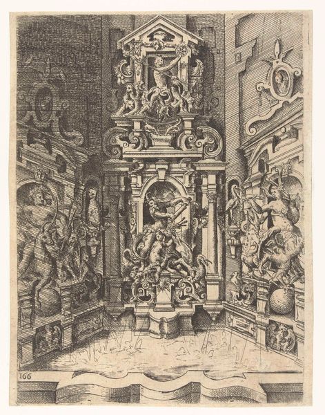 Wendel Dietterlin created this etching of the upper portion of an altarpiece with the Coronation of the Virgin, sometime in the late 16th century. The image is dominated by a complex, symmetrical structure, teeming with figures and ornamentation. Dietterlin’s precise linework creates a dense, almost claustrophobic space, reflecting the ornate style of the period. The composition is rigidly hierarchical, with the coronation scene at the very top, and the figures below arranged in tiers. The interplay of vertical and horizontal lines, coupled with the intricate details, gives the work a sense of both grandeur and complexity. Dietterlin’s approach here reflects a broader artistic concern with elaborate, architectonic forms. Through its careful arrangement of form and line, the etching evokes the religious and cultural values of its time. The altarpiece becomes a visual representation of a structured cosmos, with divine order reflected in its architectural design. This structured image invites us to consider how such displays of power and order are constructed through art.