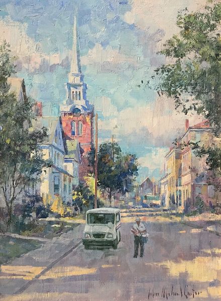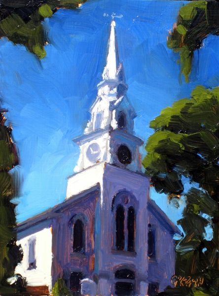 Curator: Childe Hassam’s "Church at Old Lyme," painted around 1906, is a beautiful example of American Impressionism. Using oil paint en plein air, Hassam captures a vibrant scene in Connecticut. Editor: It's instantly serene. The bright palette and dappled sunlight give it a hopeful, almost nostalgic quality. There’s something inherently comforting about that white church steeple reaching into the blue sky. Curator: The church itself becomes a powerful symbol here. Colonial Revival architecture like this resonated with a growing American consciousness at the turn of the century—a yearning for established roots and traditions amidst rapid industrialization. It became an expression of civic pride. Editor: Precisely! The church, framed by these lush, gold-tinged trees, evokes not just religious devotion but community identity. Look how the artist sets up a deliberate contrast with the verdant trees—a nod to the cycle of life, renewal, and the enduring presence of the church as its constant witness. There is harmony and strength here. Curator: Yes, and that's quite intentional. It places the church firmly in its geographical, socio-economic, and historical location. Old Lyme was, in that era, developing an artist colony, where the presence of Hassam alongside other notable figures enhanced the town's cultural capital. Hassam himself took a leading role as a proponent of Impressionism within that social sphere. Editor: Beyond just location, I feel it's also invoking a certain ethos, what's considered foundational to rural American society and history: community, faith, and the enduring allure of tradition. The church stands as a beacon—a monument that tells a silent story about its inhabitants' values. Curator: Absolutely. This artwork also became part of larger art market forces shaping American Impressionism’s popular appeal. Think about the way idealized visions of small-town life circulated through galleries and private collections. Editor: Looking at this work provides such a peaceful respite and a fascinating perspective. Curator: Indeed. Hassam’s impressionistic view and attention to the church gives a strong insight into a particular period and its cultural touchstones.