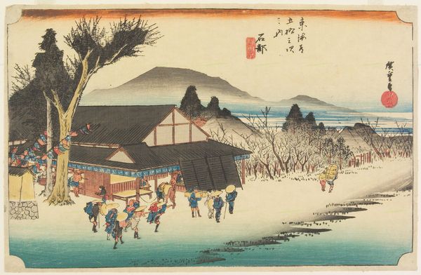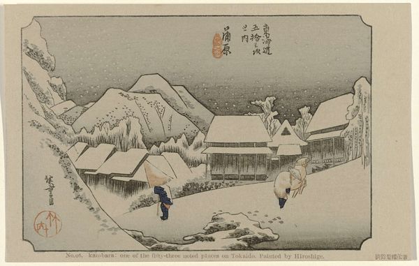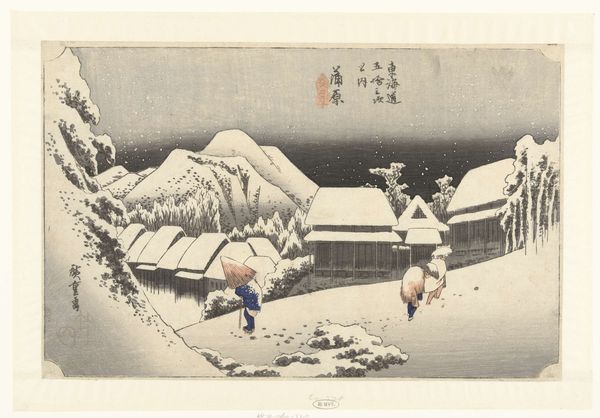 Editor: Here we have Hiroshige’s "Kanbara- Night Snow", created around 1832. It's a woodblock print, mostly shades of grey and white, with a couple of figures trudging through the snow. It's beautifully bleak. What do you see in this piece? Curator: I see more than just a landscape, I see a potent commentary on human resilience amidst harsh realities. The two figures, rendered small against the vast, unforgiving winter scene, immediately evoke questions about their journey, their socio-economic status, and their relationship to the land. Considering Hiroshige’s own travels and his keen observations of everyday life, do you think he was making a broader statement about the plight of ordinary people during the Edo period? Editor: That's a fascinating point! I hadn't really thought about it beyond the aesthetic, but I suppose it does imply a kind of struggle, especially considering the time it was made. Curator: Absolutely. Consider how landscape art, especially during this period, could often be subtly imbued with political and social critiques. Hiroshige, while celebrated for his beauty, wasn’t necessarily blind to the inequalities and hardships of the society around him. The near-monochromatic palette also directs our gaze. Is it possible this stylistic choice reflects a kind of muted existence? Perhaps emphasizing the socio-political oppression that marked much of Edo society? Editor: So you are suggesting that it is an orientalist artwork embedded with social activism. Do you really believe that there's a conversation happening with the viewer about race, identity, and marginalization, through such visual art? Curator: I absolutely do. Great art speaks to us across temporal boundaries. In our current society we strive to challenge structures of oppression that impact people based on their religion, race, class, or gender. While separated from Hiroshige by two centuries, and cultural and socio-political views, "Kanbara- Night Snow" depicts those universal emotions of loneliness, power, strength, vulnerability, that resonates deeply with the vulnerable members of our global society. Editor: Wow, I’ll definitely look at it differently now. Thanks! Curator: My pleasure! It's through these dialogues that we begin to see how art, even something as seemingly simple as a snowy landscape, can reflect and comment on the complexities of human existence across time.