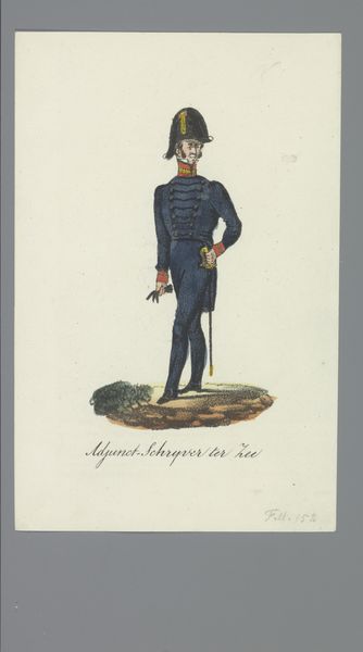 Editor: Here we have Albertus Verhoesen’s “Luitenant ter Zee der 2de Klasse,” created sometime between 1835 and 1850. It’s a watercolor painting. What strikes me is the stiffness, almost like a paper doll figure. How do you read this portrait? Curator: Ah, yes, our stoic Lieutenant. It whispers tales of Romanticism, doesn’t it? But look closer. The tiny world he inhabits. It's not just a backdrop, it’s the stage. He’s alone but assured. His hand, slightly extended as if presenting himself. Don't you find it more intimate than grandiose? Editor: Intimate, yes, but also…flat. There’s no depth, not really. Curator: Depth comes in many forms. Here, it’s in the story hinted at. The uniform meticulous in detail is what tells a larger story about societal status and one's position within a community. Think of him not as a flat character, but one framed within rigid roles of his era. Can you feel that subtle tension? The era just before photography swept portraiture. Editor: So he represents the very beginning of obsolescence, captured in watercolour? Curator: Perhaps! Or perhaps he’s a timeless symbol: a self-possessed figure standing bravely in his tiny world, caught on the cusp of massive cultural change. He might be saluting the past and bracing himself for the future. It might be all a bit too grandiose to apply to his individual experience. I almost see him smirking about it. Editor: I didn't think of the cusp of photography that's an interesting perspective! Thank you. Curator: And thank you for making me see him a little less formally today. Always good to keep these guys fresh!