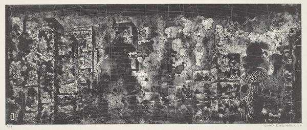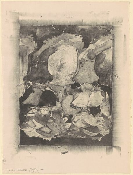 Curator: Here we have Bernard Greenwald's 1965 etching and print entitled, "Circle." Editor: It feels… chaotic, doesn’t it? Like peering into a rainstorm viewed through fractured glass. The varying textures are quite jarring. Curator: Precisely. Notice how Greenwald juxtaposes the rigidity of geometric shapes—lines, squares—with the fluid, almost uncontrolled textures achieved through the etching process. See how the circle motif dominates, yet remains incomplete, interrupted. Editor: I can't help but wonder, what statements does it make during a time rife with societal flux? Is it a comment on fragmentation, a response to the overwhelming information streams or the socio-political conflicts that fractured society then? Curator: I would propose that its value lies primarily in Greenwald's formal innovation, not as direct political commentary. It presents us with an unresolved visual dialectic, the push and pull between the planned and the accidental. The interplay of light and shadow contributes depth—inviting the eye to constantly readjust and discover new details. Editor: The eye is drawn, sure, but is also forced to contend with disjuncture, like a societal puzzle of inequality, misrepresentation and more. Are these incomplete forms reaching toward revolution or resolution? I wonder about accessibility as well. Whose story gets prominence? Is it, rather, representative of its exclusionary, privileged art world context? Curator: I see your points. However, looking purely at its structural components, Greenwald compels us to contemplate the relationship between control and chance in art. Look at that fine, etched crosshatching in the squares and grids which contrast so remarkably with the wild, swirling strokes. It's about the method, you see. Editor: While Greenwald’s formal method is noteworthy, that alone is, for me, insufficient for appreciating the piece. Understanding modernism is, at least partially, to acknowledge a responsibility to represent unheard narratives. As for Greenwald, his "Circle" prompts vital queries about visibility, agency, and inclusion, even if he wasn't intentionally thinking about that at the time. Curator: An intersection of design and execution – its effect comes from that. Editor: Precisely. Perhaps "Circle's" lack of resolution pushes us, its viewers, towards those ends.