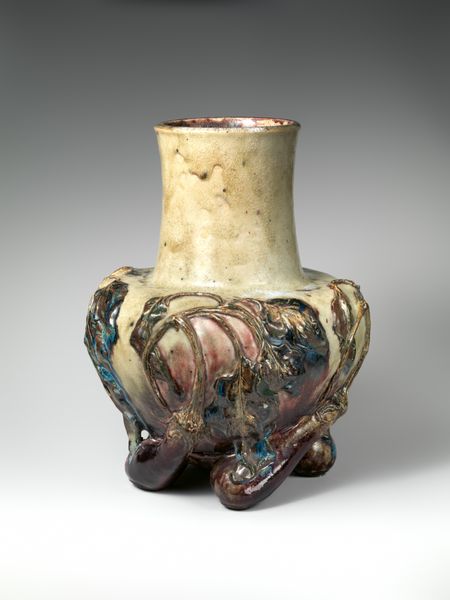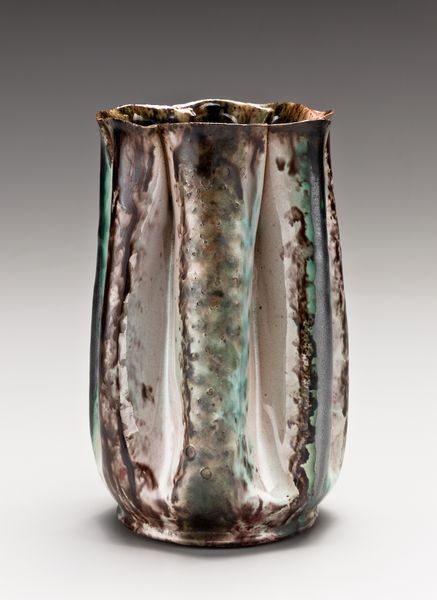 This extraordinary vase was crafted by George E. Ohr, an artist active in the late 19th and early 20th centuries. Ohr, working in a time of rapid industrialization and social change, distinguished himself through his eccentric approach to pottery. Ohr embraced imperfection, manipulating clay into radical, asymmetrical forms that defied conventional aesthetics. Here, the surface undulates with a visceral energy, as the glazes swirl and meld in unpredictable ways, creating a sense of dynamism. Ohr once proclaimed himself the "world's greatest potter," which speaks to a confidence that was at odds with the artistic conventions of his time. He saw his vessels as emotional expressions, each telling its own story through its unique shape and texture. This piece exists as an artifact and a testament to the power of individual expression.