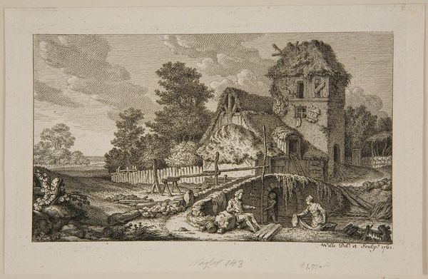 Curator: This is Franz Edmund Weirotter's "Ruins of the Saint-Maur Abbey." Editor: It's a somber scene. The etching conveys such a melancholic sense of decay. Curator: Note the masterful use of line and texture to create depth. The formal qualities are quite striking, particularly the composition's balance of light and shadow. Editor: I find it intriguing how ruins often become sites of leisurely gathering. Who are these figures, and what does it mean that their lives intersect with this crumbling monument? Curator: The architectural ruin provides a structural frame, doesn't it? See how Weirotter uses the arches to guide our eye? Editor: And yet, this depiction of decay subtly underscores the transient nature of power. Curator: Indeed, a very evocative piece. Editor: It certainly gives us pause for thought.
