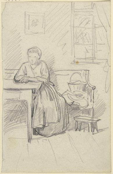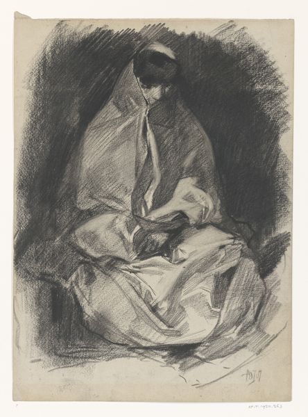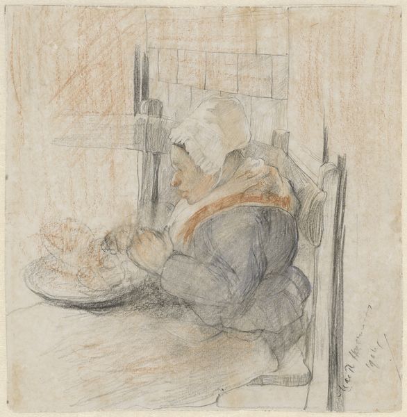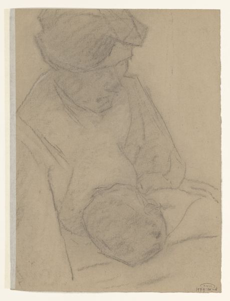 Jacob Simon Hendrik Kever created this drawing, titled "Zittende vrouw met kind op schoot", using brown chalk. The drawing presents a woman seated, cradling a child, rendered in soft, muted tones that create a somber and intimate atmosphere. Observe how Kever employs subtle gradations of light and shadow to define the forms of the figures. The composition, dominated by vertical and horizontal lines, reinforces the stillness and solemnity of the scene. The artist uses line and shadow to create a sense of depth, yet there is a flatness, avoiding the use of perspective, which keeps the eye focused on the surface of the drawing. This flatness draws attention to the materiality of the chalk and paper. The visible strokes and smudges of the chalk emphasize the process of creation. The drawing, in its formal structure, highlights the tension between representation and abstraction.