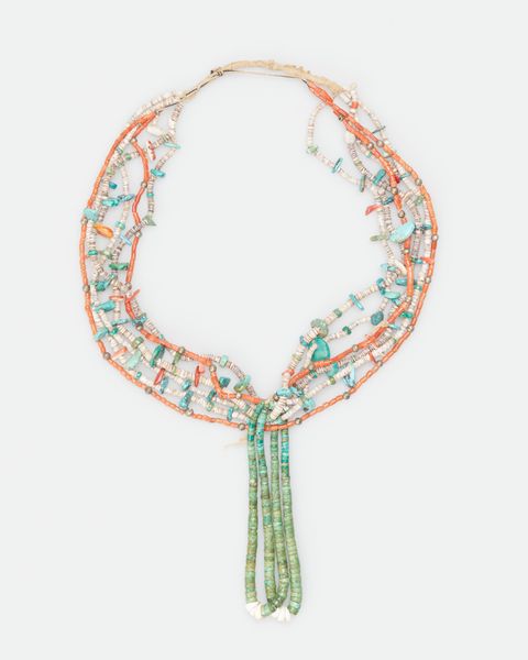 This necklace, created by an anonymous artist, invites us to consider the intersection of adornment and identity. The turquoise beads, carefully strung, speak to the traditions of craftsmanship passed down through generations. Necklaces like these often hold deep cultural and personal significance, serving as symbols of status, protection, and belonging. Their creation and wear are intertwined with gendered labor, where women play a crucial role in beadwork and adornment practices. Consider the hands that threaded each bead, the stories and experiences embedded within the piece. The necklace reflects the historical and social contexts of its creation. The use of turquoise, a stone often associated with healing and spiritual properties, suggests a connection to the earth and ancestral knowledge. It transcends mere decoration, embodying a complex interplay of cultural identity, personal narrative, and historical context.