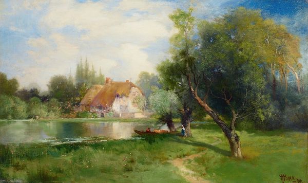 Editor: So, this is "Landscape with trees, houses and river," an oil painting by Lev Lagorio from 1878. It’s… kind of dark, isn't it? There's a definite contrast between the sunlit path and the deep shadows of the trees. What symbols or underlying meanings do you find in it? Curator: Darkness and light are primary symbols here, aren't they? This contrast highlights not just the visual elements, but a deeper duality. Think about the Romantic movement Lagorio was influenced by, and how they frequently used landscape to explore human emotion. This image taps into the cultural memory of the pastoral ideal, the "return to nature", yet something feels…off, doesn't it? Editor: Off? In what way? Curator: The figure walking the path… she almost disappears into the scene. Do you see her face? She's less an individual, more an archetype. What do you make of the fact that she appears to be entering into the darkness of the trees rather than emerging from them into the light? Perhaps she represents humankind's venture into the unknown, into the deep and possibly unsettling parts of our collective unconscious. Editor: I didn't really notice that! I guess I just saw it as a pretty picture. Curator: And it *is* a pretty picture, intentionally so! Yet Lagorio invites us to look beyond the surface, to ponder our relationship with nature and the human condition. In its depiction, we have access to universal concerns about the cycle of life, death, and what might lie beyond the world of light. Editor: It’s fascinating to think about those hidden layers, it's definitely given me a whole new perspective on the painting. Curator: Exactly! By understanding the artist’s cultural and symbolic language, we appreciate how deeply art engages with both memory and mystery.