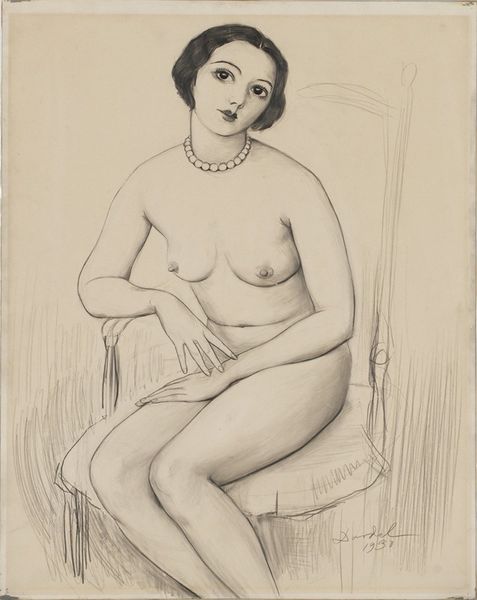 Nils Dardel made this painting, Marthe, in 1930, and it looks like he used oil paint or maybe gouache. I’m struck by the direct gaze and pose of the model – she seems to be looking both at us and somehow within herself. The paint is applied in thin layers, and you can see Dardel's hand in the small brushstrokes. I'm drawn to the way he's rendered the skin tones, using soft hues to give a sense of warmth. It's like he's tracing the light as it falls across her face and body. Notice how the fingers on her right hand are slightly blurred, almost dissolving into the background, while her other hand is positioned to draw attention to her body. This contrast feels intentional, as if Dardel is trying to direct our gaze. Dardel seems to be in conversation with other artists like Matisse, who shared his penchant for depicting intimate, interior worlds. Like Matisse, he invites us into a space of contemplation and introspection, where the boundaries between the viewer and the viewed begin to blur.