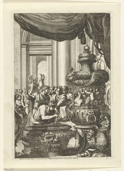 This is Romeyn de Hooghe's "Allegorie op de gebeurtenissen in het jaar 1680," an etching brimming with the textures and intricate details characteristic of the late 17th century. The composition is structured around a theatrical arch, framing a distant scene of a triumphant procession. Dominating the foreground, allegorical figures of Justice and royal figures sit amidst symbols of power and prosperity. Note how de Hooghe uses linear precision to delineate each element, from the ornate costumes to the architectural backdrop. The structured composition invites a reading of the events of 1680 through the lens of power, justice, and historical narrative. The complex arrangement and variety of symbols within the etching function as a semiotic system, where each image is a signifier. The artist uses these signs to communicate specific meanings related to the political climate and cultural values of his time. De Hooghe’s use of line and form reflects broader philosophical concerns about representation, authority, and the interpretation of historical events.