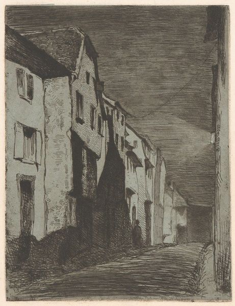 Curator: Here we have James Abbott McNeill Whistler’s 1858 drawing, "Saverne," rendered in ink on paper. What's your immediate take on it? Editor: I am immediately struck by a sense of loneliness; the narrow, rising street, dominated by the austere buildings, creates an almost oppressive atmosphere, only underscored by the solitary figure walking away. Curator: Note the contrast between the tight linework defining the architecture, the very calculated perspective suggesting depth, against the more free-flowing, almost hazy rendering of the sky. There’s a real tension created. Editor: Absolutely, the perspective forces our eye to a vanishing point—almost erasing the individual figure in favor of structural constraints. Considering the urbanization of the 19th century, doesn’t it provoke questions about how the built environment dictates the lived experience and how cityscapes can reinforce class divisions, especially if one has to labor to live? Curator: I see your point. I would emphasize instead how the romantic aesthetics meet a certain realism here. The detailed depiction of the Saverne buildings meets the loose impressionistic interpretation. Editor: Don’t you think that romanticization itself serves a certain political function? By aestheticizing urban poverty, the art indirectly mutes discourse of real human suffering under industrial capitalism. Curator: While a valid point, I wonder if we should credit the piece with more formal innovation and subtlety. Whistler is still quite young when he makes this piece. Notice the skillful execution and unique sense of spatial organization that he develops through shadow and the density of his linework. Editor: Yes, the artist's skills with ink are undeniable. However, an artwork doesn’t just live in aesthetic isolation, it’s engaged and reflective of complex, lived environments. That is also worthy of discourse. Curator: A fair point. Both these vantage points underscore its complexity and continuing relevance. Editor: I'll carry away my feelings of urban solitude but thank you, it was rewarding to discover a sense of the historical currents captured here.