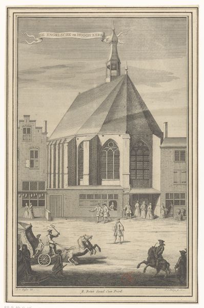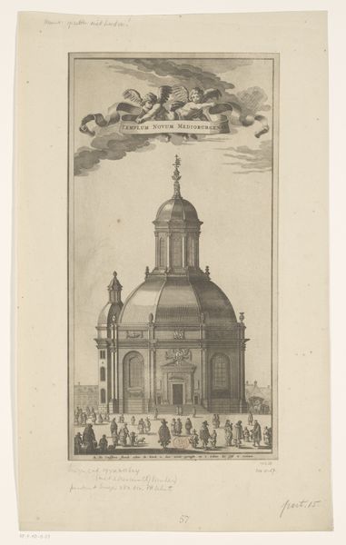 Curator: Editor: Here we have "Gezicht op de Marekerk te Leiden," a 1762 engraving by Abraham Delfos. The scene is quite serene, capturing a grand architectural structure along a waterway. What do you see in this piece? Curator: Beyond the architectural rendering, consider the printmaking process itself. Engraving demands meticulous labor, doesn't it? The burin’s repetitive action, cutting lines into the copperplate. Note the precise delineation used to produce this cityscape. It transforms architecture and the surrounding activity into commodities. Editor: Absolutely! I’m struck by the stark contrast between the grand architecture and the daily life bustling along the canal. How does this reflect Dutch Golden Age sensibilities? Curator: The Dutch Golden Age was built upon trade. Consider how readily these prints would have circulated – serving as both artworks and records, feeding into and shaped by an economy increasingly dependent on reproducibility and exchange. This print is also about civic pride; the Marekerk becomes a symbol of Leiden. Does the print’s function challenge our conventional understanding of artistic value, wouldn't you say? Editor: That's a really interesting way of thinking about it – blurring the lines between art and product. Curator: It certainly asks us to re-evaluate those boundaries, especially within the context of materials and labor! Editor: I hadn’t considered the economic implications of printmaking so deeply before; I was so focused on the aesthetics. This definitely changed how I will perceive engravings from now on. Curator: I’m glad! Seeing the work as not just an image but also as a product shaped by—and shaping—its historical economy really opens things up, don't you think?