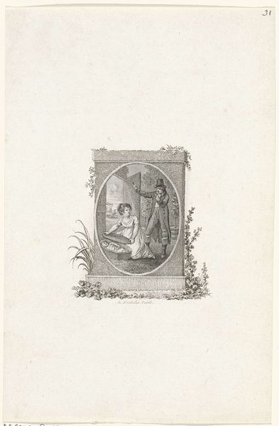 Editor: Here we have Reinier Vinkeles' "Woman with a Helmet by a Half Column," created around 1800. It’s a print, a pencil and engraving piece. I'm immediately struck by the woman's confident posture, but the classical imagery feels a bit… removed, distant. How do you interpret this work? Curator: This piece invites us to consider the loaded visual language of Neoclassicism. We see a woman, allegorically adorned with a helmet, juxtaposed against the rigid structure of a classical column. Consider the period, around 1800; what do you think such symbolism was communicating, especially concerning ideas about female virtue or citizenship after the French Revolution? Editor: I see what you mean. The helmet and column suggest strength and tradition, but it’s also very controlled. It feels like a specific idea of womanhood being presented. Is it maybe about defining women's roles in the wake of revolution? Curator: Exactly. And let's think critically about that column – it’s only half there. What might that fragmentation represent? Perhaps a break with the past, but also an incomplete vision of the future. The woman gestures outward, towards something beyond the image itself. Could she be pointing towards an active role, even within a restrained symbolic framework? What do you think this image says about the constraints of the period on people living through revolutionary times? Editor: That's a really interesting point about the fragmented column and the active gesture. I hadn't considered how the composition itself speaks to the tension between revolution and restriction. This makes me think about the ways societal expectations of women persist and evolve even in moments of great change. Curator: Precisely. By examining the visual codes within the piece and thinking about the historical context, we can explore the complex relationship between artistic expression and social commentary, allowing for a greater understanding of women during revolutionary times. Editor: I definitely see it differently now. It's less a distant image and more a snapshot of a complex social moment.