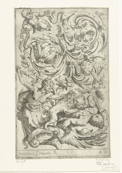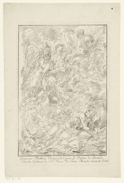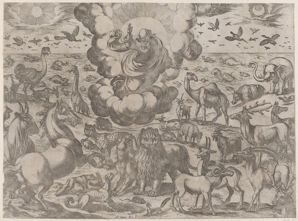 Curator: Looking at this piece, I am immediately struck by its turbulent energy. It's a maelstrom of figures and textures. Editor: This engraving, known as "Jupiter calming the storm at sea," dates back to between 1515 and 1566, though its creator remains anonymous. We are fortunate to have it here at the Rijksmuseum. Consider the era's societal and political turmoil reflected in this tempestuous scene. Curator: The symbolism is overt, but powerful: Jupiter, god of the sky, amidst the churning chaos of the sea. Those horses emerging from the waves–surely emblems of brute power and the unbridled forces of nature? The faces of the putti or cherubs looming in the sky… ominous or benign? It's a visual language speaking to control, or perhaps the limits of control. Editor: Yes, I find it telling that even divine intervention appears less about pure beneficence and more about the assertion of dominance. The gendered and power dynamics within classical mythology invite critical exploration, particularly within patriarchal societies. Does this reinforce those power structures or subtly question them by highlighting the fragility of order? Curator: That's a keen point. One could argue the composition itself, so densely packed and fraught with action, speaks to a fear of chaos barely held in check. Consider also that in some cultural memory, the sea represents the subconscious—untamed emotion—a challenge to patriarchal control over female domains, perhaps. Editor: Absolutely, and let's not forget the print medium itself. The relative accessibility of prints at the time meant these mythological narratives could reach a wider audience, influencing the prevailing understanding of power and authority across various social strata. One might see it as very early propaganda. Curator: Seeing how different meanings can emerge through different contexts and perspectives is enlightening. Editor: It truly underlines the importance of engaging with art beyond just aesthetics. Every mark, every figure, carries layers of history and ideology ready for us to unpack.