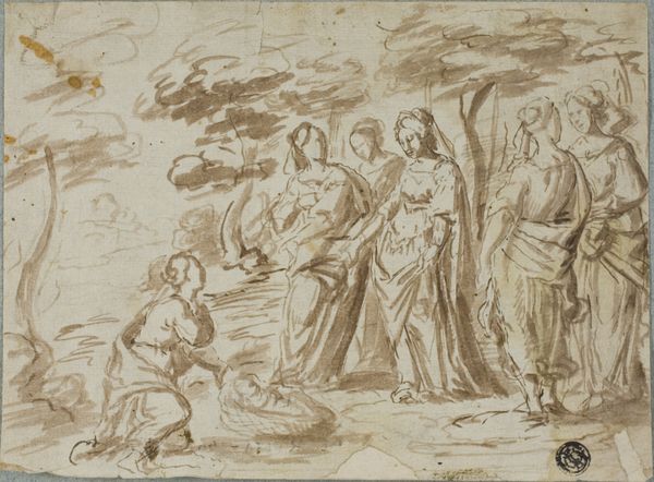 Curator: Giovanni Francesco Romanelli created this drawing, called *Blessed Ascending to Heaven.* Editor: Wow, it feels so light, so airy! Like the whole scene is just exhaling into the heavens. You’ve got this crowd, these figures huddled together, but they don't seem weighed down. There's a real sense of ascension about the drawing. Curator: The interesting thing about a piece like this is trying to determine its role within a larger system of patronage. Romanelli was working in Rome in the 17th century, deeply embedded in the world of papal commissions. Drawings like this were often preparatory studies, proposals even, for larger painted works that would adorn churches and palaces. Editor: It's like catching a fleeting thought, isn't it? Pen and ink and chalk on paper… he’s captured movement so well, like a swirl of bodies and anticipation. Do you think the softness, that sort of sepia wash, helps add to the feeling of transcendence? Curator: Absolutely, that restrained palette serves the scene. By limiting the colour, all the attention can focus on the emotionality and the story of ascension, in this case perhaps something more complex and contested. The Church invested heavily in visual messaging during this era; images could serve to sway opinion, inspire piety and reassert power amid social and religious turmoil. Editor: So, an instrument of power as well as spiritual expression? Because to me, the raw beauty of the drawing – those figures reaching up, the angel guiding them… there's a tangible sense of hope in that upward movement. Like escaping something, leaving the earthly behind. Curator: And remember, what *we* see now as a beautiful drawing might then have been viewed as a step towards something greater, grander and more politically significant within a system of patronage. Though it speaks to both worlds. Editor: I love how that tension gives it life now, this quiet, reverent scene that's maybe humming with bigger ideas. Like a whispered secret, somehow. It makes you think about your own… ascent, whatever that might mean. Curator: Indeed, a simple drawing then becomes a window into understanding the intricacies of its historical moment and the long-lasting influence it has had on our ways of seeing art and understanding the artist’s ideas.