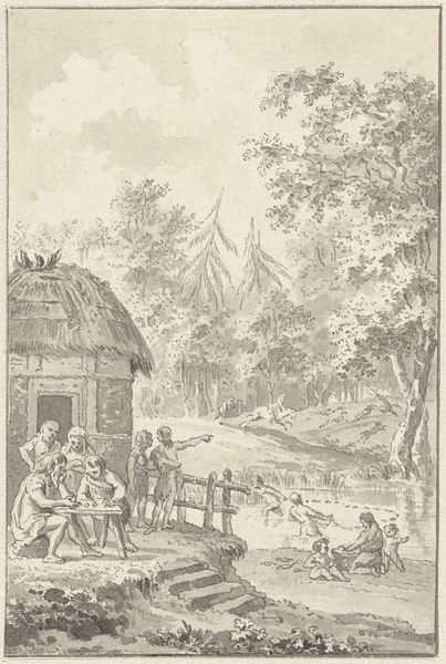 Curator: Let's take a look at "View of a River" by Hendrik Roosing, created in 1780. It's a beautifully detailed engraving, part of the Rijksmuseum collection. Editor: It has a lovely pastoral quality. I'm immediately struck by the balance – a sort of asymmetrical symmetry created by the detailed trees on the right and the boat on the left. A slice of daily life made permanent in the age of Enlightenment. Curator: Precisely. The engraving technique allows for exquisite details. Roosing is depicting a very specific time and place, isn't he? Observe the positioning of the figures and the implied social hierarchy. People in carts are separated by proximity from the working man walking the road. Editor: And notice the interplay of light and shadow. See how he uses fine lines to suggest the shimmer on the water and the rough texture of the thatched roofs? I find that compelling from a purely formal perspective – how he builds the entire image with these delicate strokes. What do you think that might mean for a viewer in the late eighteenth century? Curator: I'd suggest it romanticizes labor, fitting a demand of idyllic representation, almost masking the harsh realities of rural life for both wealthy patrons and a burgeoning middle class wanting to connect to simpler ways. The inclusion of the title “Te Berkel” indicates that this slice of life isn't some fantasyland, but rather a real village where real people navigate real structures of society. Editor: A perfect summary, really. You know, seeing the river depicted as this central artery reminds me how essential such waterways were for trade and transportation. That small community in the etching probably thrives precisely because of its geographic access to broader routes. The tiny windmills there in the background make an important contribution to trade. Curator: It speaks to how artistic interpretation can offer a multifaceted view. We see the aesthetic choices, the artistic skills involved, but also the historical context informing not just the artwork’s creation but also its subsequent viewing. Editor: A fitting end, I think, bringing both the structural and societal elements of art to light for us. Thanks for your time.