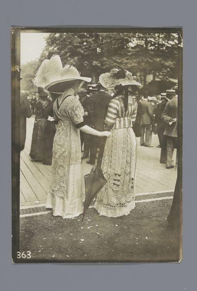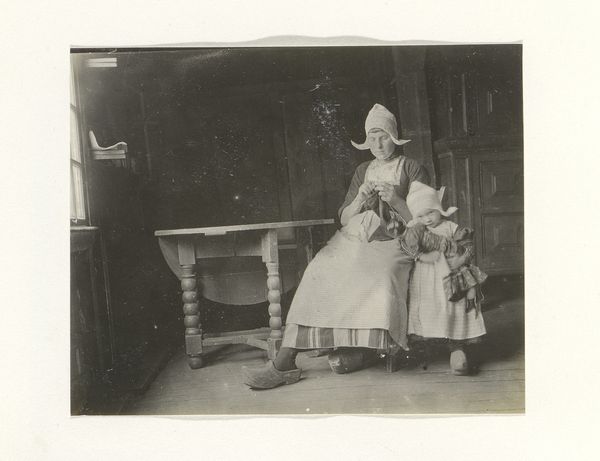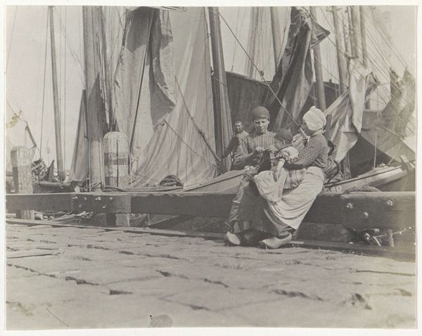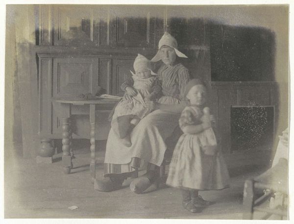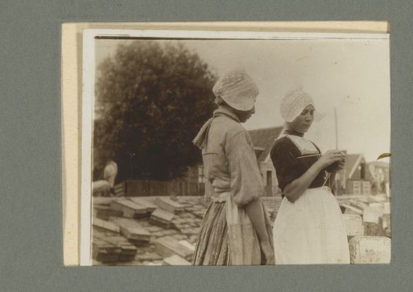 Curator: Editor: So, this is a photograph called "Groepsportret van vijf meisjes in klederdracht, vermoedelijk in Volendam" which roughly translates to a group portrait of five girls in traditional clothing, presumably in Volendam. It’s from around 1900 to 1910, photographer unknown. It's just a black and white photograph but there is such a strange sense of melancholy radiating from the image, in part to the expressions, I would guess. What is your interpretation? Curator: Formally, the subdued tonality dictates the overall mood. The image displays a fairly limited range of grey tones. Can you notice how the composition directs your eye? Editor: Well, there's a central grouping of figures set against a softer, less detailed backdrop, what appears to be part of a ship or fishing net maybe? Curator: Precisely. Notice how the tonal contrasts – the lighter bonnets against the darker dresses – emphasize the faces and the geometric arrangement, guiding our attention. Editor: That's a very clear effect, yes. But how might we approach reading these forms for deeper meaning? Curator: We need to consider the relationships created. The positioning of the figures relative to each other creates an interesting pattern, a sort of non-verbal syntax that gives form to a mood of self-imposed solemnity, reinforced through the use of formal attire. Note that there are multiple triangles repeated between the women, emphasizing connection and unity. How does their stance affect your reading? Editor: They seem constrained and quiet, withdrawn into themselves despite being so close. The symmetry of their garments with slight variations and of the shapes does give that feel of the shared sentiment or mindset that may be culturally motivated or expected? Curator: Indeed, the balance between similarity and subtle difference among them gives an aesthetic feel of unity, which contributes greatly to the photograph's formal tension and visual cohesion. Editor: I see how focusing on form opens up pathways for understanding! Curator: Likewise, your reading underscores the importance of historical grounding in interpreting such visual codes.