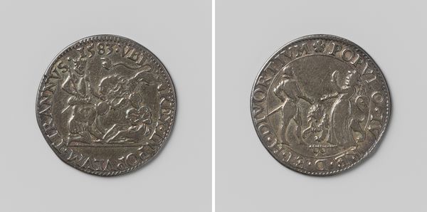 Editor: This metal relief sculpture is titled "Tweeentwintigste kapittel van de Orde van het Gulden Vlies te Antwerpen, ter ere van Filips II, koning van Spanje, souverein van de orde," made by an anonymous artist in 1556. It feels… surprisingly intricate for a small, functional object like this. What’s your take on this piece? Curator: I see a carefully crafted object that speaks volumes about power, identity, and the complex social hierarchies of 16th-century Europe. We're not just looking at a commemorative object; we are looking at the very performance of sovereignty. Consider Philip II of Spain, whose image is strategically deployed. The Golden Fleece isn’t merely decorative. Editor: So it’s all about image management? Curator: Exactly. The Order of the Golden Fleece represented an exclusive network of power. Displaying this image was carefully constructed to communicate not just power, but a certain divine right. Note the specific ways that it reflects cultural norms of masculine power through dress, gesture, and the surrounding symbols of authority. Editor: That's fascinating. I hadn’t really considered how performative these objects could be. How might this object have been perceived then versus how we perceive it now? Curator: In its time, this was probably read by some as an exercise of sovereign power but the very circulation of it might have triggered skepticism as well as awe in equal measure. Editor: Thank you so much, that contextual background is really helpful to understanding the layers of meaning here. Curator: My pleasure, I hope the next time you see a portrait like this you’ll read all of those underlying contexts and claims to authority.