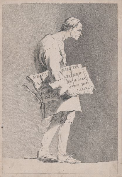 This caricature by Johan Michaël Schmidt Crans was made in 1860 with pen and ink. The eye is immediately drawn to the linear precision and stark contrast, typical of graphic satire, capturing a moment rife with political tension. The composition divides the scene between two figures: one, weighed down by a scroll inscribed with virtues and burdened by a hunting horn, and the other, standing at the doorway of '2e Kamer'. The artist uses line to create texture and volume, yet the absence of color shifts the focus to the symbolic weight of these forms. This work is not merely representational but performative. It uses exaggeration to challenge fixed meanings, engaging with broader questions of power and representation. The contrast between the figure's virtue and the closed door suggests a critique of political access, underscoring how art can destabilize established values through structural means.
