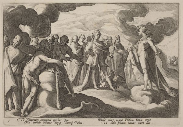 Curator: Here at the Rijksmuseum we have an engraving called "Triumph of Truth." It was created sometime between 1558 and 1656, but the artist is anonymous. Editor: Whew, a lot’s going on. Baroque allegories, right? First impression? Claustrophobic heavenly bliss. So many tiny figures all crammed together. It gives me the shivers, like an overly enthusiastic school play. Curator: "Triumph of Truth" encapsulates the era's fervor for didactic imagery. Note how the radiant, central figure of Truth, surrounded by cherubs, hovers above earthly figures displaying various reactions to her unveiling. Editor: Oh, they are reacting. There's some intense, like, zealous eye-bulging down there. But is it really triumph? Look at the fallen crown and scepter. To me, it hints more at a violent uprooting, a system overturned. That poor snake doesn't seem happy either. Curator: Exactly. The discarded symbols represent earthly power being vanquished by divine knowledge. The figures below symbolize humanity grappling with this revelatory truth – denial, acceptance, fear… all mirrored in their postures. The putti convey the divinity's unearthly blissfulness. Editor: I get it, this clash between earthly struggle and divine serenity... the figures are dramatically arranged, like players on a stage, which reinforces that performance aspect. But the dense detail! The crosshatching creates such intensity that you can almost smell the ink, or the brimstone. Curator: Consider how line becomes meaning itself. The swirling lines of the clouds versus the sharper angles defining the human forms show an artificial contrast. It visually reinforces that this battle, the embrace of truth, remains an unfinished, almost uncomfortable transition. Editor: The discomfort is palpable! What seemed initially like an uplifting vision has, under closer inspection, unveiled a raw, messy encounter. That’s something to hold onto. Curator: Absolutely. And remembering its place in the socio-religious climate further underscores its cultural resonance, how Truth can be weaponized, defied, revered all at once. Thank you for sharing this fresh, insightful vision. Editor: My pleasure. Sometimes, a bit of shiver is just what you need.
