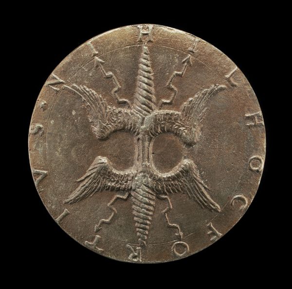 Curator: I’m immediately struck by its diminutive scale, almost intimate. It looks like a portal to another world. Editor: Indeed. Here we have a bronze relief crafted by Master IAC. URB. in 1554, titled "Vase in a Landscape [reverse]". It is a striking example of Renaissance medal work. The patination adds a layer of complexity, wouldn't you agree? Curator: Absolutely. The texture feels rich and aged, like gazing upon something unearthed from centuries ago. It seems more tactile than visual at first glance. It begs to be touched. Does that impulse betray a purely sensual apprehension? Editor: Not at all. Touch allows engagement that parallels close scrutiny. The composition is quite clever. A classical vase is centered. Beneath it, a landscape unfolds—a townscape at left mirrored by craggy hills at right. Note the inscription encircling the relief's edge. The text emphasizes the medal’s historical function, commemorating both subject and patron. Curator: That inverted landscape has a dreamlike quality. It’s as if the vase is dreaming it, or perhaps drawing it into being. The figures in the landscape are minuscule yet the rendering has incredible definition. There's a distinct contrast between the central vase and the almost frantic detailing of the rest of the composition. Is it a reflection on history’s chaotic unfolding versus art’s capacity to frame it? Editor: That contrast underscores the Renaissance fascination with antiquity filtered through humanist perspectives. We find classical forms juxtaposed against close observation of nature and lived experience. The very medium—bronze—cites the past while the miniaturist approach echoes manuscript illumination traditions. There is perhaps tension at play between permanence and ephemerality. Curator: It leaves you contemplating what’s contained versus what’s boundless, fixed forms and constant flux. A conversation about what art *does* in relation to time and our experience of it, rather than a mere depiction. The vase as container, landscape as process... fascinating! Editor: Indeed, a dense dialogue rendered within the confines of a handheld object. Quite ingenious, really.